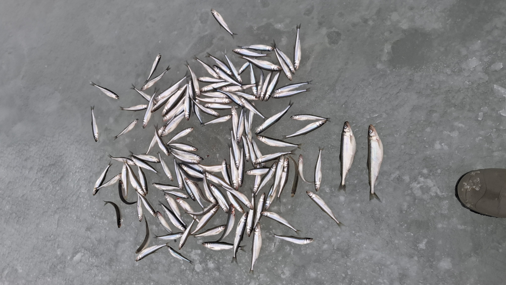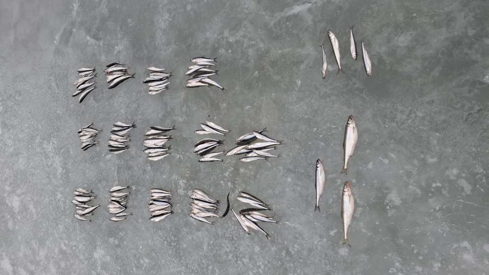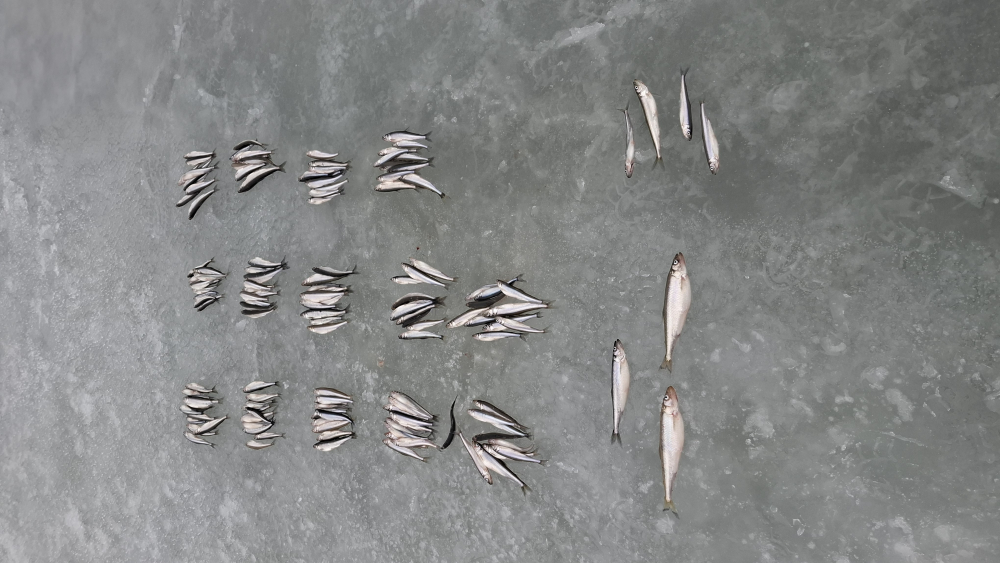 Пятая вылазка за корюшкой (02.03.2025) с уловом не стабильно. На двоих рыболовов результаты 1.950(44шт) 2.200 (47шт). Лёд 8-10 см появились живые трещины. с ветром такой силы от берега и плюсом по погоде. Решено воздержаться от поездок на южный берег. Наживка ёрш и карп, глубина 19 метров.