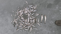 Сегодня отличная погода и клев присутствавал ловили на десять удочек в троём ,глубина 17-23 метра, 322 корюшки и 50 бычков.Всех с праздником!