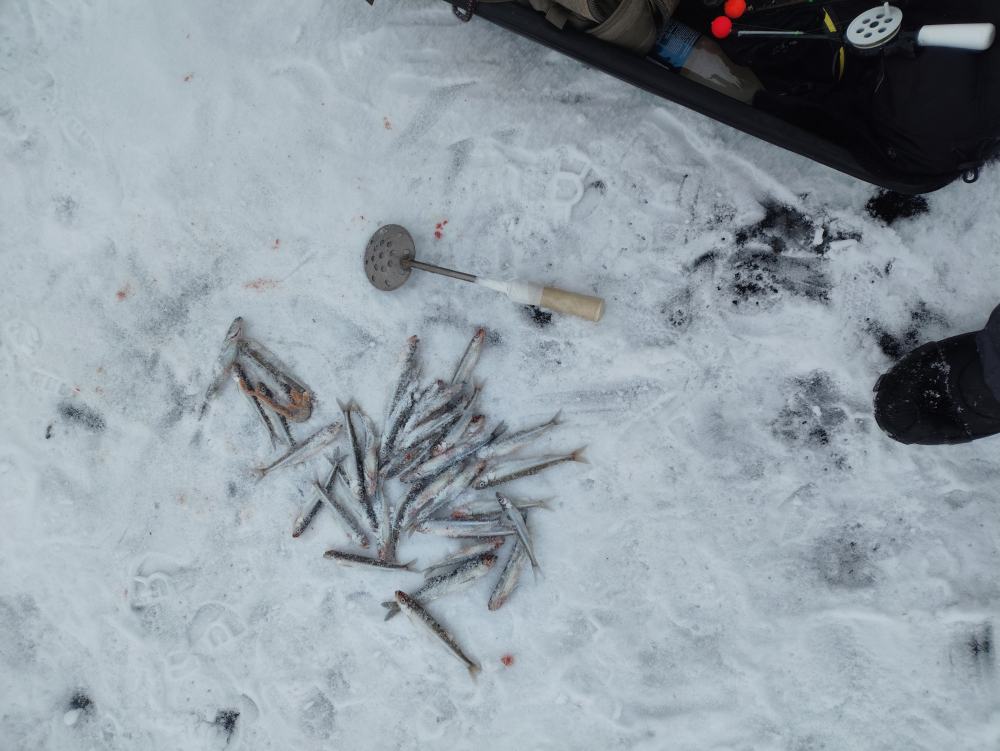 Смолячково, сегодня. Пешком идти неприятно, ледяная корка проваливается, тяжко. Так примерно половина пути до того места, куда возит подушка. Обошел их и встал чуть правее. Как начало плклевывывать обсверлили с 4-х сторон. Выставил батарею из 9 удочек и ловил вместе с сыном, он таскал, я в основном, обслуживал. Итого 77 штук и 1 бельдюга. На обратном пути уже где-то полшестого у берега 4 окушка с чьей то лунки. Слышал про уловы 0 и 5 штук. Глубина около 17 метров. Вокруг нас понемногу полавливали. Основная разновидность-розовый снеток, крупных две. Клев весь день, но лучше с 9 до 11 и с 14:30 до 16:30. Думаю, килограмма полтора поймали.