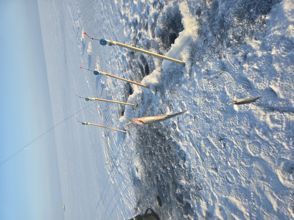 Нашёл свои старые лунки, со вторника. Расставился, сразу начала клевать. Причём та же удочка на том же месте, что и в прошлый раз, которая делала результат. Потом подошел Леонид, и сказал что мы совсем на другом месте...