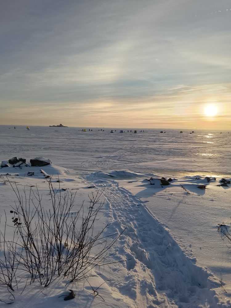 Сегодня той же командой Кирилл, Миша и оранжевый рванули на дальний кордон. Спасибо Андрею, закинул нас в нужное место. Смотрю, народ уже смело ходит у дальних створов. Ушёл дальше, начал с балансира и блесны. Ни тычка, ну ладно, думаю. Достал мормышку, взял одного, дальше пошли прищипывания, всё по классике. Окунь перемещается, и не всё его привлекает. Стал менять мормышки, объём, цвет, форму и вес. Окунь двигался вдоль берега на глубине около 1,5–2 метров. Подобрал, белая мормышка его привлекала. Сразу начал методично доставать полосатиков, размер на завялку сойдёт. Крупные горбатые ребята стояли выше, для них только игра нужна с количеством наживки. Иногда попадались, был обрыв, был ещё сломан крюк. Погода, конечно, давала свои коррективы. Минус 11 с ветром, временами снег, ну всё, как мы любим. Справился, сидя в своём домике. Мормышеть нужно козявками, лунка замерзает, её заносит, снег налипает. К вечеру переместился ближе к плёсу. Не бегая, спокойно с одной лунки поднял ещё чутка, причём на блесну. Жалко, ушла уловистая блесна вместе с хорошим горбачом. Общался с рыбаками, у кого два окуня, у других по-разному. На рыболовном календаре видел, написано: клёв слабый. Но мы, рыбаки, народ терпеливый, упорством и смекалкой всё равно возьмём своё!