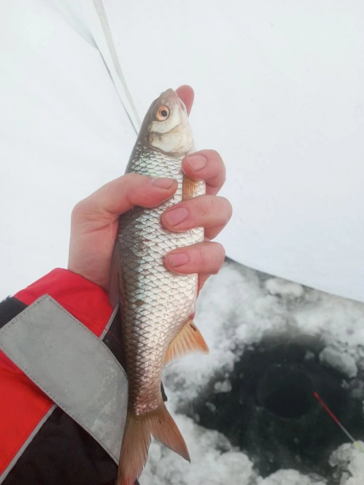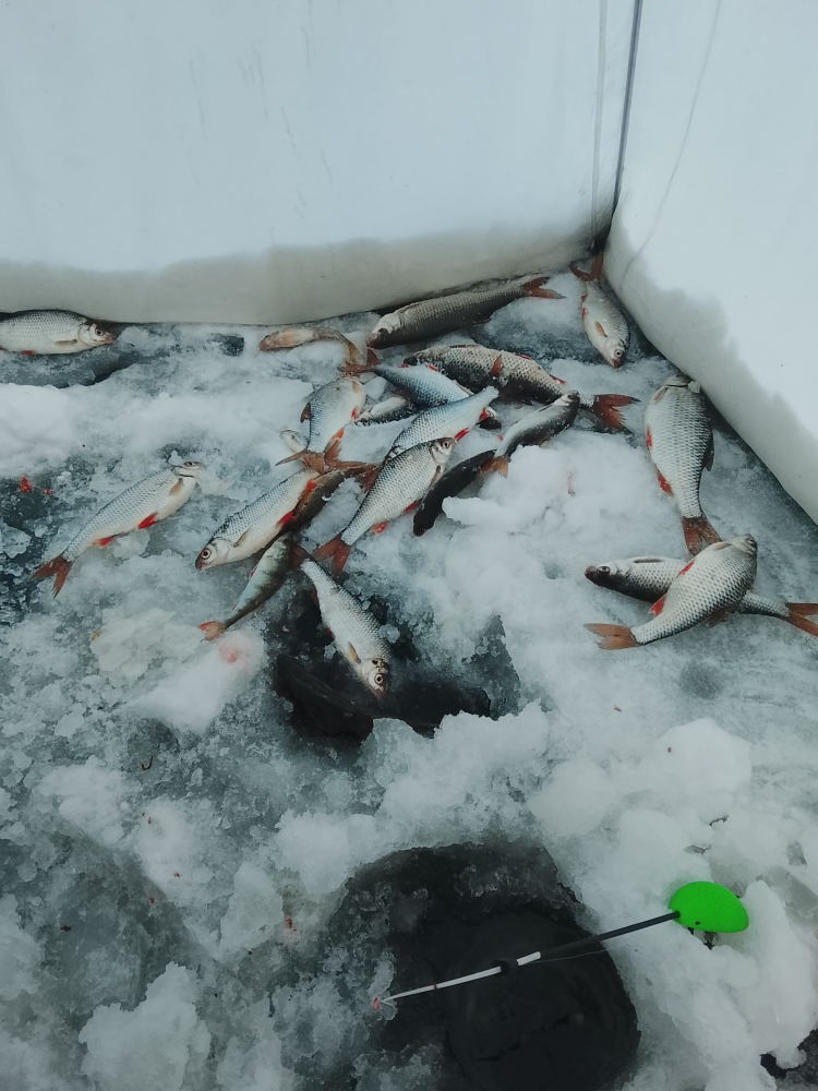 В три дня пошел к Большому Шурику в палатку, обрыбился парой окуней на мормышку.