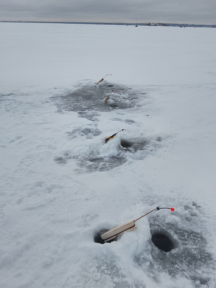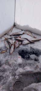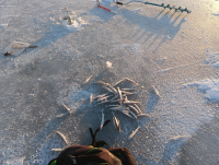 На блесны было поймано десятка два окуней весом от 30 до 100гр, густера и несколько ершей. На жерлицы сработки были, но холостые. Клев закончился примерно в 12:30, дальше один мелкий окунь с 3-5 лунок и надо еще уговаривать.