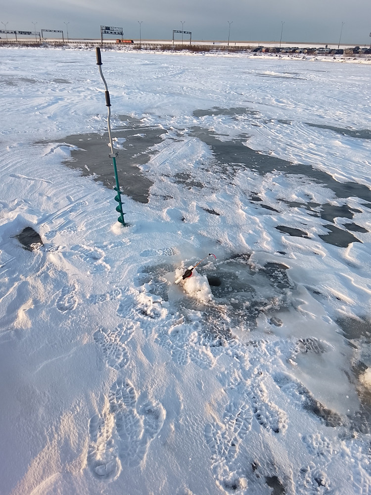 На стоянке пока спокойно- мест полно, народу человек 50-80 от силы. Лёд в порядке- около 15см, монолит. С 11 до 14 у меня 3 поклёвки, напарник оправдал свою старинную кличку - Шурик-мимо-рыбы))) Но все равно хорошо время провели.