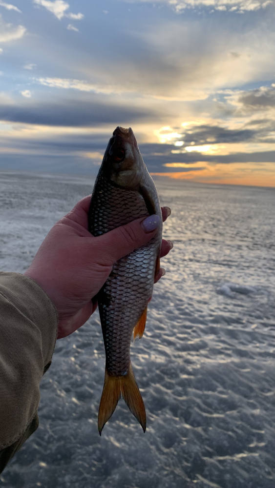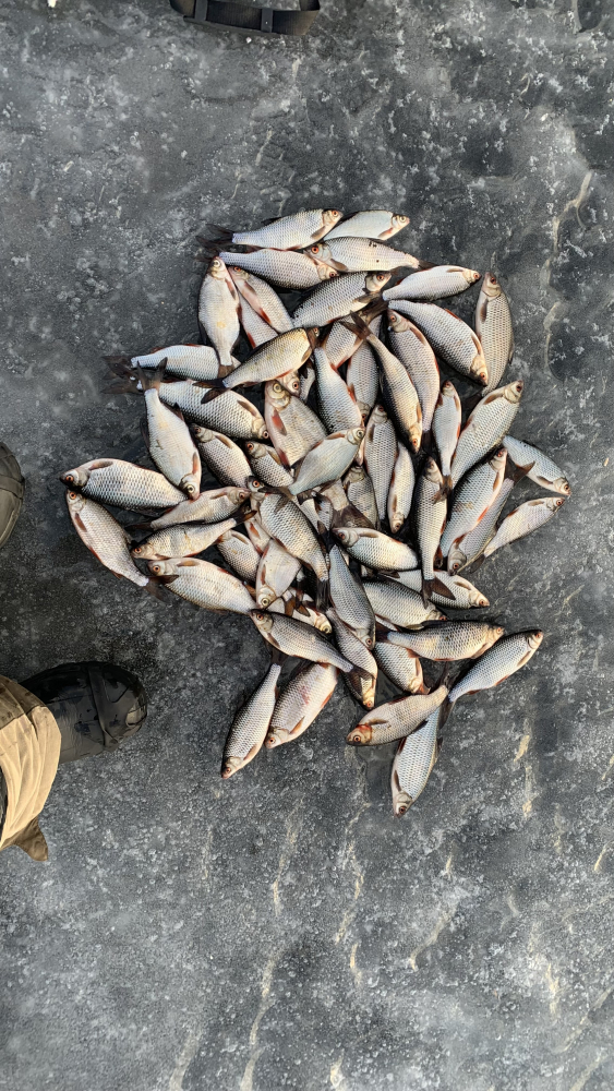 Лед ещё держит, но думаю дня 2 и ему конец. Очень много местами лёд уже на игле. Доехали на аэролодке на 10 километр. Встали подальше от толпы, закормились. Ветер был неприятный, поэтому ушли в палатки. С 15 до 17:30 клева почти не было, рыбу надо было искать. Но мы на ветру бегать (тем более по такому льду) не рискнули. С 17:30 рыбка подошла и к нашим лункам. Решили всё-таки остаться на ночь. Ночью рыбка клевала хорошо с небольшими перерывами (с 22 до 01:30, с 2:30 до 4:30, с 5 до 6). В нашей компании у всех клевало по-разному. Лично я сменила 10 мормышек, остановилась на козе с подсадкой опарыша. Брала только на игру на падении. На стоячку почти не клевала. У друзей клевала на стоячку на 2 крючка. Подкармливали рыбу постоянно. По итогу у меня 10 кг плотвы и густеры. У друзей на каждого по 8-10 кг ! Мы довольны )) замерзли немного, устали сильно, но что хотели получили !))) И на жареху, и на вялку, и на фарш хватит !Уехали домой в 8 утра. На фото улов не весь, лень было всю рыбку из пакетов доставать !)