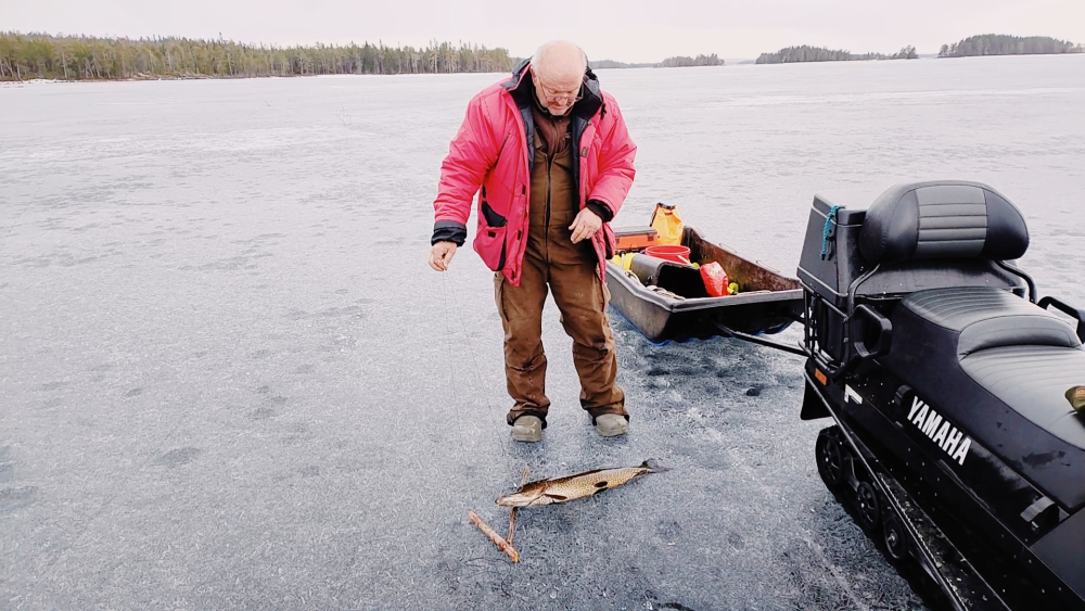 Карельское озеро встретило нас чистой, дивной северной природой, льдом в 50+- см. 10 километров гружёные и вооружённые до зубов мы легко преодолели до зимовья на снегоходе. Беседка, баня, костровище, изба на острове. По пути на остров удалось уже вечером на блесну поднять с пяти метров трёх чёрных, как сажа, икряных окуней, один зачётный. Успели до темна поставить шесть жерлиц. Жду с нетерпением рассвета.