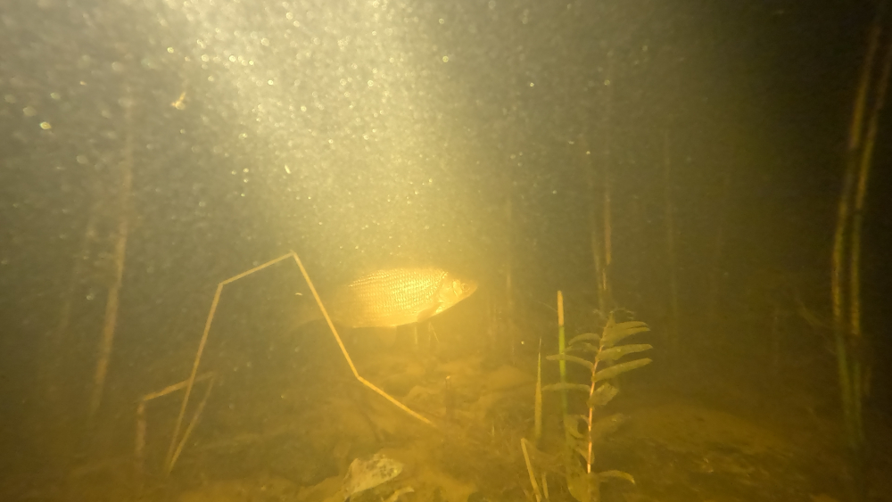 Нырялкой это не назовёшь, но во время так сказать плавания я набрёл на место с хорошим жирным карасём. Стадо этих серебристых рыб я проредил на несколько штук, самый крупный у меня на почти кг, а самый карлик на 600 грамм.
