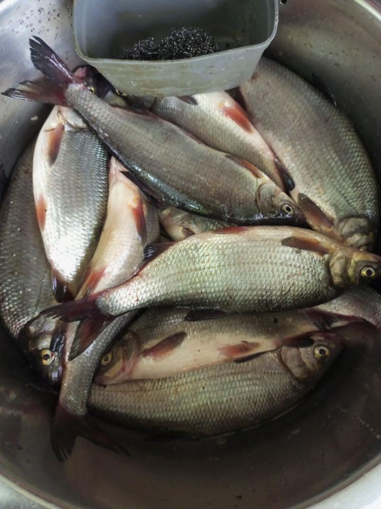 Две поклевки и две реализации. Особи, которые из Тосны случайно забрели под правый берег. И попали в желтое патиленовое ведро.