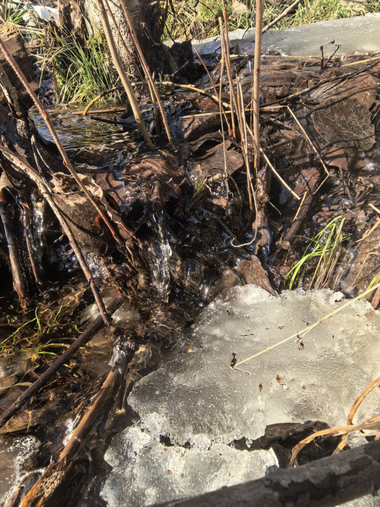 При выходе пришлось перейти 2-х сантиметровый брод ажн метровой ширины, где корка не держала, далее как по асфальту, воду достать можно было только если идти по немногочисленным снежным полянкам, остальное все замерзло и изредко только потрескивало. Все субботние лунки замерзли, ничего не моет, можно идти с закрытыми глазами, если не боитесь потерять направление.