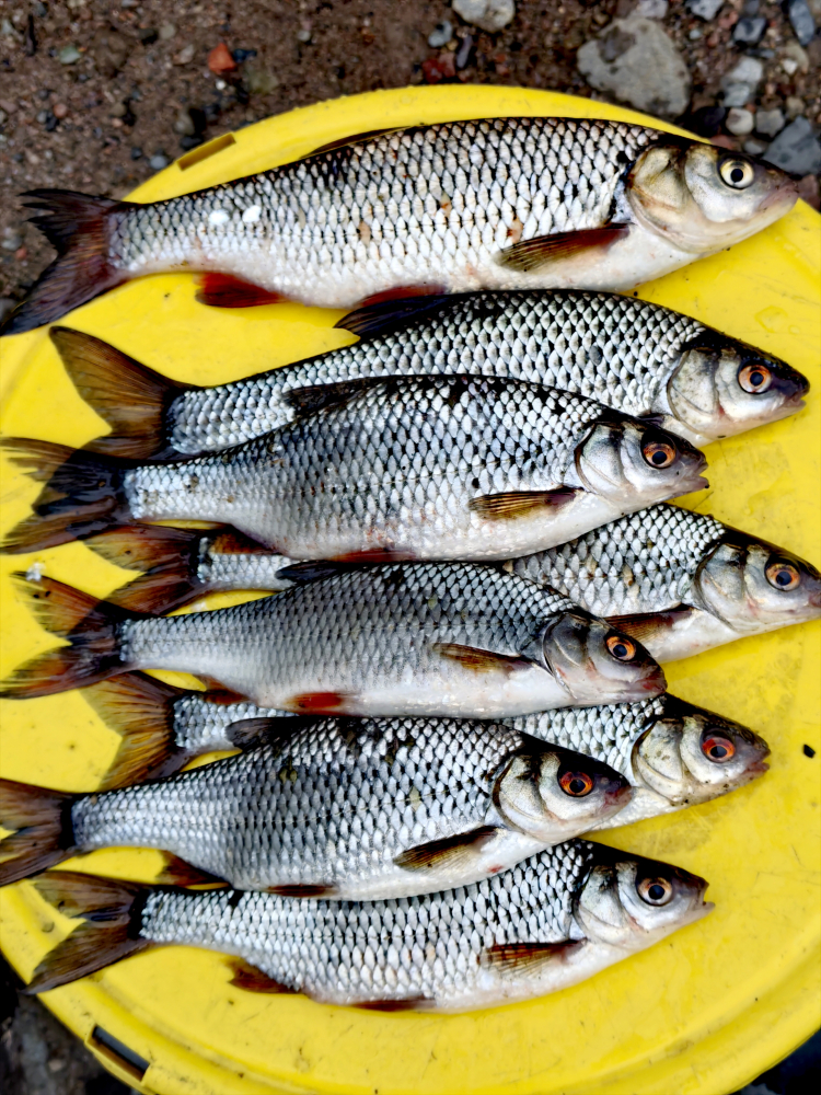 Опустил якорь на трёх метрах, прикормил, и вскоре плотва начала собираться. Она с удовольствием брала пучок опарышей на крючке. Ловил я до одиннадцати утра, и за это время успел поймать около десяти литров рыбы.
