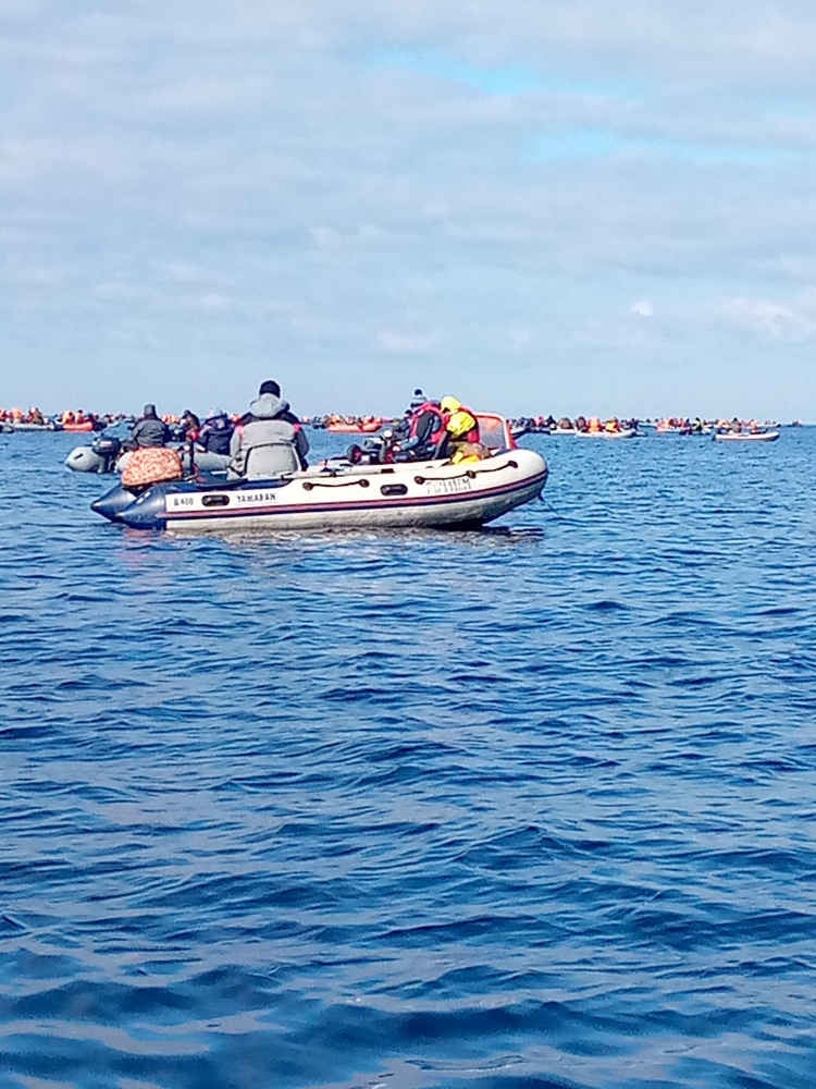 сегодня, вышел в 8 утра со Шпунтов, лодок на воде тьма штук 350-400..