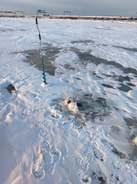 На озере, из 10 одна сработка. Вытащил тоже не сразу, так как багорик тоже забыл. Помогло, что лёд очень тонкий и дырка на 150. Засыпал всё снегом, промёрзло, под закрывашками, где то на пол см.