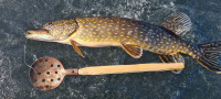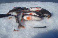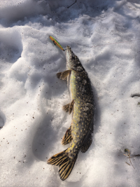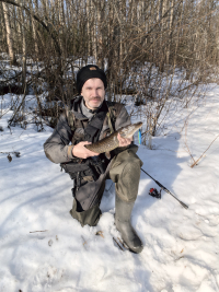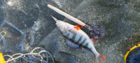 Закрыл зимний сезон. Лед местами черный, структура как иголки, в тех местах, где лед белый, за день верхняя половина превратилась в кашу. Окунь держался на пупках 4-5м, но в основном мелкий, ловился на все блесны и балансиры, серии по 10-20 с лунки. На глубине 8 м было пусто, глубже не пошли, лед не вызывал доверия. Приличных всего два, 400 и 370 гр., несколько 100 граммовых. Жерлицы сверкнули один раз и в холостую, ставили от 4-8м.