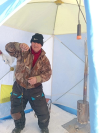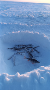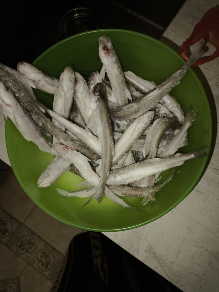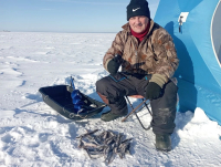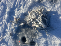 Сегодня экипаж 3 человека. Погода жесть. Итог 8, 7, 7 корюшин. В прилове одна бельдюга и один ёрш. По эхолот у рыба есть, но не ест.