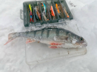 Вчера на улице как-то зябко, да и ветерок, поэтому решил провернуть трюк десятидневной давности с палаткой. Навигация с утра была не очень, но кое-как точку нашёл. На всякий случай подкормил немного, мало ли кака-то залётная плотвичка приплывёт. А так забросил, как в прошлый раз, в одну лунку удочку с одной мормышкой, а в другую блесёнку с мотылём. За первый час поимел сход с мормышки, а на снасть с блесёнкой попались окунь и ёрш. Второй час поклёвок не принёс, поэтому вылез на волю, себя показать и людей посмотреть. По округе уныло перемешалось несколько человек. Пробурил пару лунок, в одной из которых попался окунь, но продолжения долго не было. Даже немного адаптировался к холоду, но это потому, что не клевало, и морозить руки насаживая мотыля не приходилось. В конце концов решил, что пусть лучше не клюёт в палатке, зато там теплее. Потом, то ли приплыло несколько окуней, то ли понял, как его уговорить, но поймал ещё четырёх окуней. Окунь для ФЗ по размеру нормальный, правда, если 10 дней назад он был чёрный, так сказать в боевой раскраске, то сегодня какой-то бледный. И клевал соответственно, с самого дна, и поклёвки иногда просто угадывались. Наверное, надо бы удочку с леской потоньше и с маленькой мормышкой, но я таких снастей не держу. Я думаю, что у рыбы есть календарь, глядь, а там пятница 13, в такой день лучше воздержаться от клёва. 6 окуней и ёрш, может хватит на маленькую кастрюльку ухи? НХНЧ.