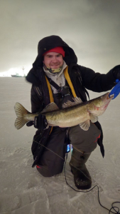 Кричу: “Мужики, рыба колом стоит, помогайте!”. Ребята бодро подскочили, рукой поправили рыбу в лунке, для надёжности прихватили за нижнюю губу липгриппом и не без труда, но выволокли судака на свежий воздух.