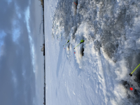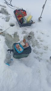 Репино, вторая вылазка. По темноте прошел от флагштоков прямо, по следам снегохода. По дороге колья попались(артельщики 2 сети поставили). Вышел на глубину метров 8( руками отменял, пока кормушка опускалась). Второй удочкой не смог ловить, хватило одной. С 9 до 10:30 50 штук плотвы. Все толстые. Насадка опарыш. Отсчитал полста, пакет полный. Свернулся и к дому.