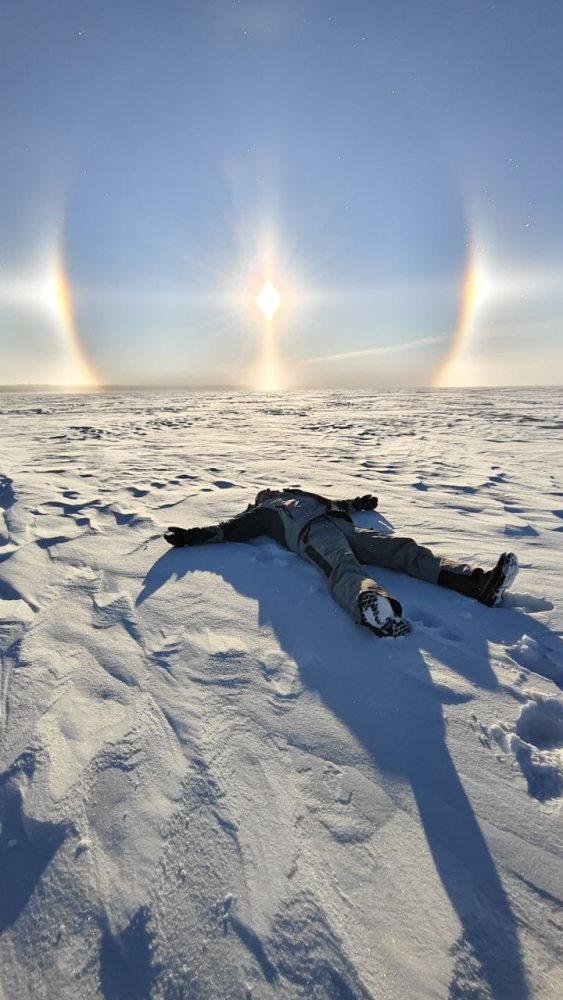 Сегодня, 23 февр. Друзья: Рома, Лëша, Саша и Юрик.. На стоянке в 5:50.. машин много, но места были. По 100 гр за праздник и с рассветом вышли через пешеходный переход.. "мля" еле заползли на ледяной бугор со скарбом.. др. другу помогали🤪..
