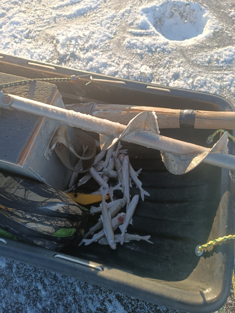 Выход из деревни. От машины до точки 1.7 км. Глубина 13 -14 м. Ночью ушел лёд. Получается что сидели не далеко от воды. Лёд хороший, погода не очень, клёв не очень. В час домой. Итог 18 штук. Наживка окунь.