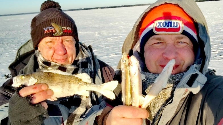 На льду с трудом вытерпели два с половиной часа. После чего позорно сбежали. Мороз по термометру в авто -19. Ветер поземкой лунки заметал почти сразу. У меня руки сводило от холода на открытом воздухе секунд за 30 после того как я их доставал из муфты на груди.