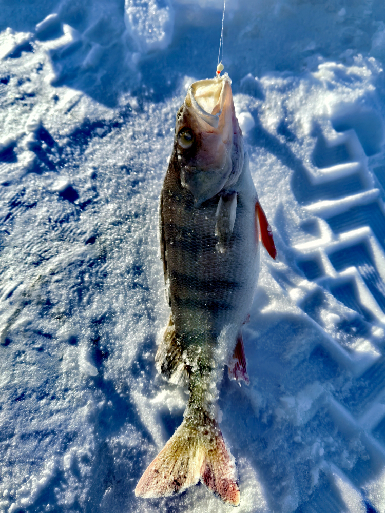 Вчера на улице как-то зябко, да и ветерок, поэтому решил провернуть трюк десятидневной давности с палаткой. Навигация с утра была не очень, но кое-как точку нашёл. На всякий случай подкормил немного, мало ли кака-то залётная плотвичка приплывёт. А так забросил, как в прошлый раз, в одну лунку удочку с одной мормышкой, а в другую блесёнку с мотылём. За первый час поимел сход с мормышки, а на снасть с блесёнкой попались окунь и ёрш. Второй час поклёвок не принёс, поэтому вылез на волю, себя показать и людей посмотреть. По округе уныло перемешалось несколько человек. Пробурил пару лунок, в одной из которых попался окунь, но продолжения долго не было. Даже немного адаптировался к холоду, но это потому, что не клевало, и морозить руки насаживая мотыля не приходилось. В конце концов решил, что пусть лучше не клюёт в палатке, зато там теплее. Потом, то ли приплыло несколько окуней, то ли понял, как его уговорить, но поймал ещё четырёх окуней. Окунь для ФЗ по размеру нормальный, правда, если 10 дней назад он был чёрный, так сказать в боевой раскраске, то сегодня какой-то бледный. И клевал соответственно, с самого дна, и поклёвки иногда просто угадывались. Наверное, надо бы удочку с леской потоньше и с маленькой мормышкой, но я таких снастей не держу. Я думаю, что у рыбы есть календарь, глядь, а там пятница 13, в такой день лучше воздержаться от клёва. 6 окуней и ёрш, может хватит на маленькую кастрюльку ухи? НХНЧ.