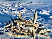 Сегодня экипаж 3 человека. Погода жесть. Итог 8, 7, 7 корюшин. В прилове одна бельдюга и один ёрш. По эхолот у рыба есть, но не ест.