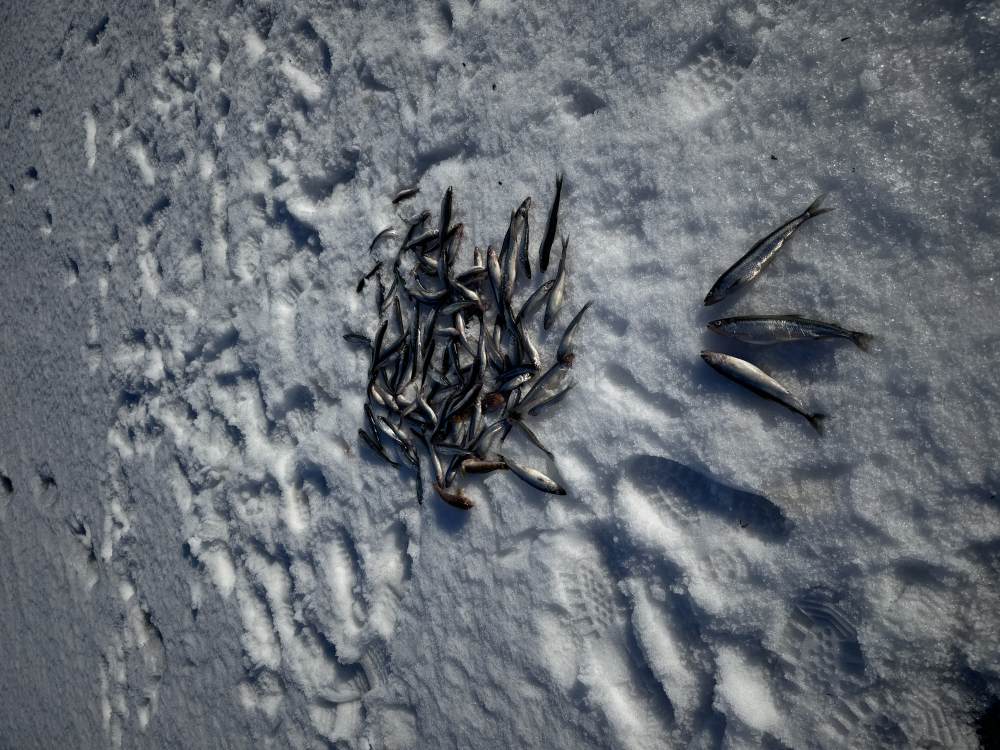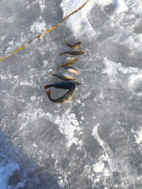 06.03.2026 - Вчера,Зеленогорск в сторону Комарова, 4.8км от берега, клевала на все с самого утра(карась, мороженный ерш итд) - глубина 12м, - По итогу 166шт и 124шт, на фото кучка в 124шт...Выезд с утра был хороший(подсушило, вода под коркой примерно 200м от берега, далее хорошо ехать), на выходе чуть подраскисло - Солнышко и плюс...