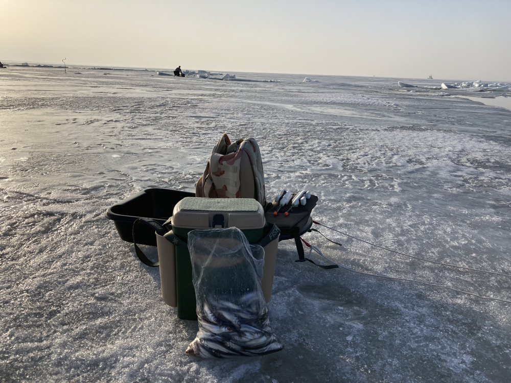 Сегодня у решетки почти не раздавали. До 9-ти поймал 11 корюшек, потом провал, в полдень 2 бельдюги. И всё. В 14 домой. Были люди, которые локально попрыгивали, но их немного. Был за торосами. Близко не свернитесь к ним, кто поедет, метров на 25 до и за ними двойной лед.
