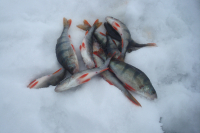 Сегодня на берегу был в 09-00. По воде у берега, чего я боялся, всё нормально, т.е. вода есть, но мало. Зато много снега, идти удовольствие для избранных, да ещё с утра туман. Немного отошёл, а берега уже не видно. Навигатор с утра даже не включал, решил ориентироваться по народу. Остановился в чистом поле на глубине 8 м, посидел, ничего. Чуть в море сидело 3 человека, явно не на корь, решил попробовать там. Там глубина была 8,5 и чуть больше, но тоже ничего. После этого и прошёл то чуть, а глубина уже больше, чем на метр больше. Там кто-то тронул блесну, ага. Посидел и поймал двух, правда, весьма некрупных, зато зацепился. Ну а больше и рассказывать особо нечего, со следующей лунки больше десятка, через лунку такой же результат, потом вообще больше 20 шт. Клюёт в основном аккуратно, часто поймать удаётся не с первой поклёвки. Зато ловить можно в удовольствие, хошь стоя, хошь сидя, никто не мешает, ходить-то тяжело, поэтому народ не бегал. Рядом ловили два парня, но они не мешали. Давно не ловил, чтобы было так тепло, рукавицы почти не надевал, лепота. В 15-40 решил: "А куда мне столько рыбы?" И пошёл к автобусу.