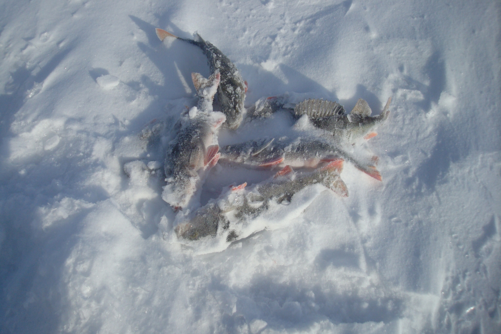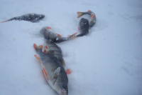 Всем привет, сегодня 12.02.- от берега 2,2 км., снега много, но старое место нашел, наживки - карась, корь, ёрш, клёв слабый, гл.-14 м., первая в 9.00, ушёл в 16.30,результат 62 шт.,и 1- окунь около 300 г., погода класс.