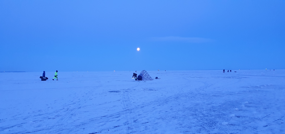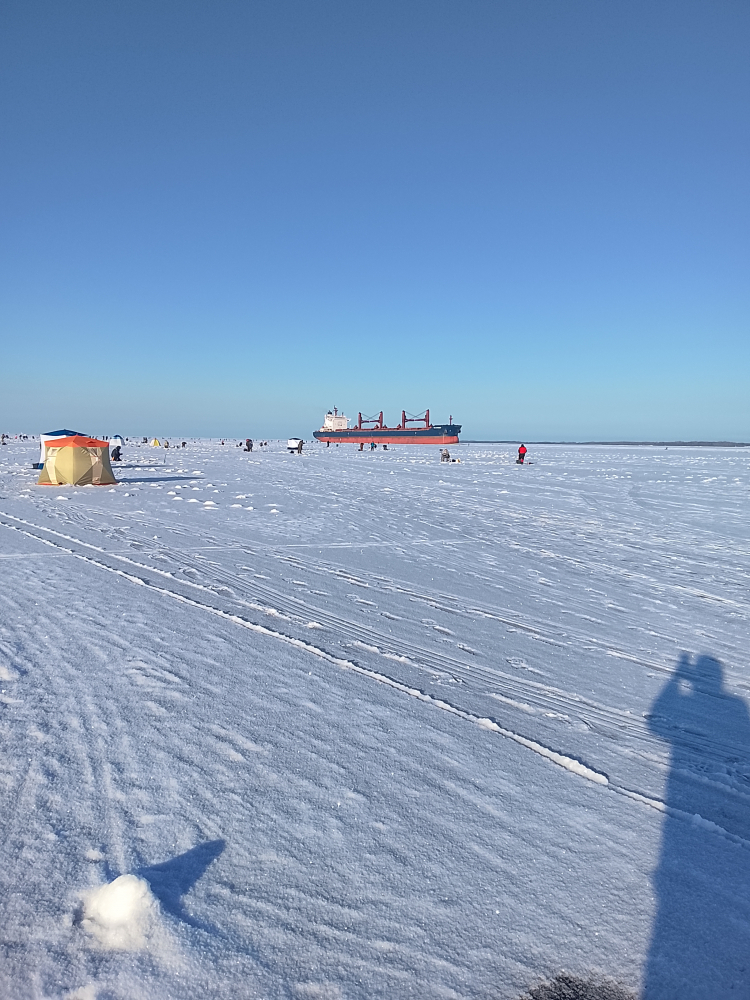 Приехали в 7:20, места на нижней парковке ещё были. Поднялись у решетки- красота, палаточный город и везде фонарики))). Встали на старом фарватере, глубина 11м. Карася нынче не достать , взял у напарника кусок леща. Первая кровь в 8:45, с 9 до 11 немного поклевала, а потом все хуже и хуже. Прикол! В 11 подошёл мужик, сидел сзади меня. Ни поклевки у него, попросил "взаймы" корюшину. В итоге он часа в 2 дня смотался и ушел по-английски))) То ли так и не поймал, то ли забыл про "взаймы".