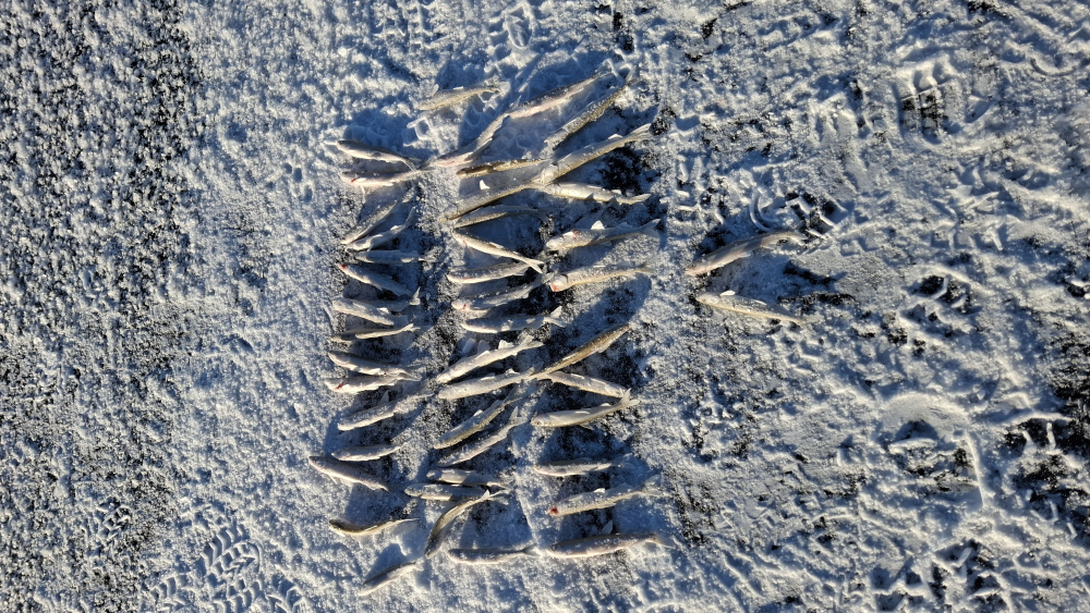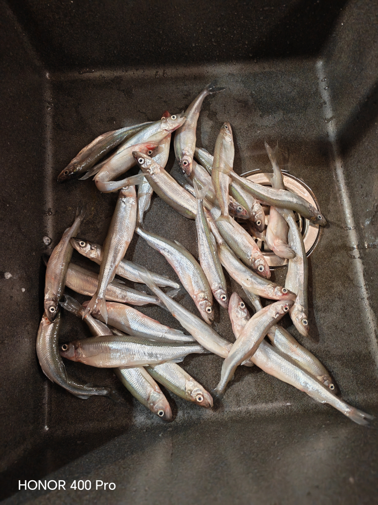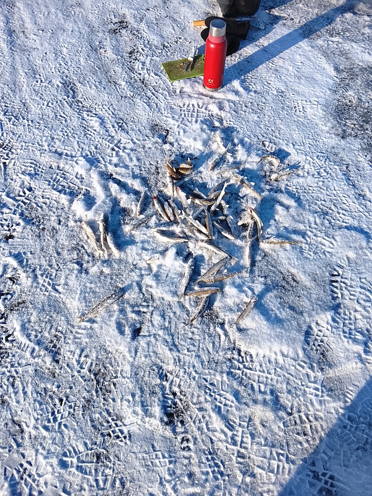 Вчера с утра были дела, поэтому поехал на вечерний клёв. От решётки метров 500. Насадка несвежий карась. С 15.00 до 16.00.-глухо. В 16.00. вытащил окушка с ладошку, перезарядки удочки свежатиной и "понеслось". За полтора часа поймал 29 корюшин средне-мелкого размера( 0,7 кг.). Было 2 дуплета. 80 % корюшки поймано на удочку с маленькими мормышками.