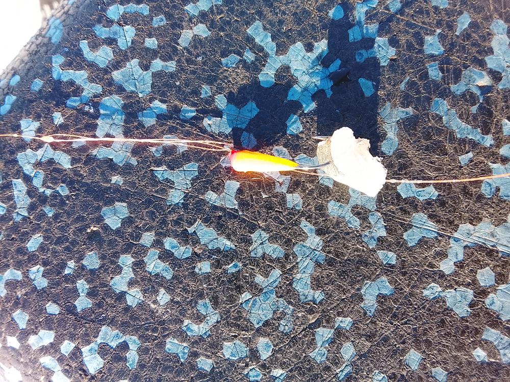 В итоге в 17 свернулся. Вечернего клёва так и не было. Улов 65 штук. На фото самая уловистая мормышка сегодня. 90% улова на снасть с блесной вместо груза. Классические кобылки молчали весь день. В прилове бычок и ёрш( его почикал, но толку не было)