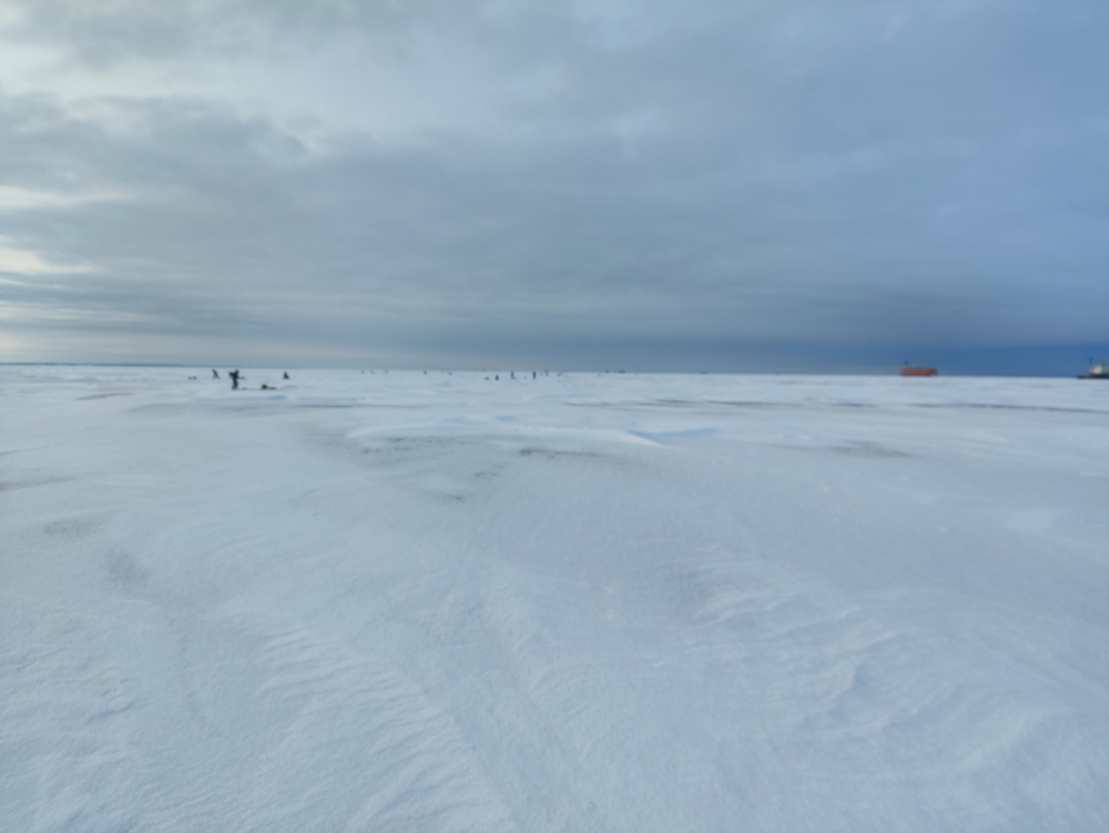 Примерно 3 км хода, идти комфортно, торосы в пару местах, а так снег почти весь сдуло. В 10 на месте, глубина 11-12 метров. С утра позёмка, лунки моментом заметает. До 12 плохо, потом чуть поклевало. В 16:30 посчитал, думаю, надо до ровного числа добить))) Добил, улов ровно 70.