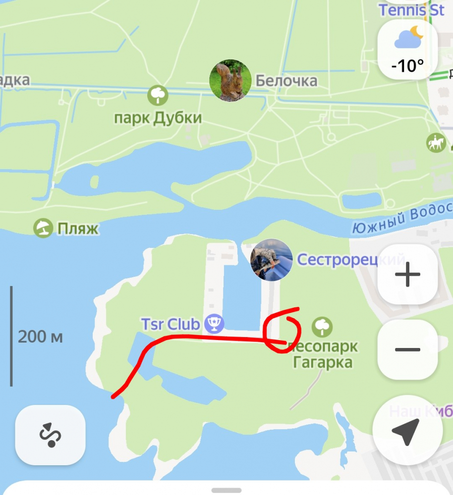 Там единственный в лесопарке Гагарка. Мимо него от парковки до берега 300м, красным отметил маршрут